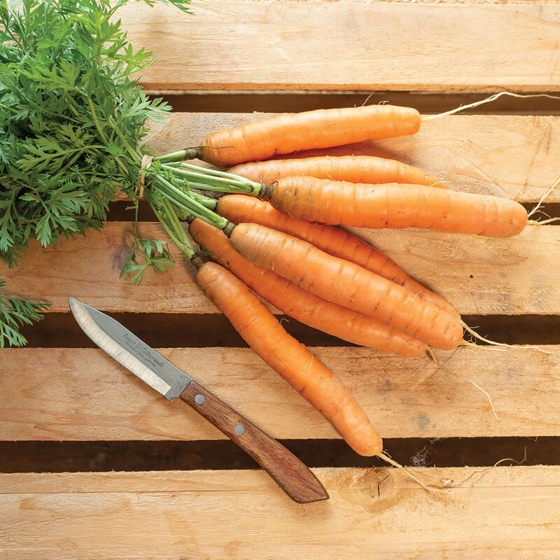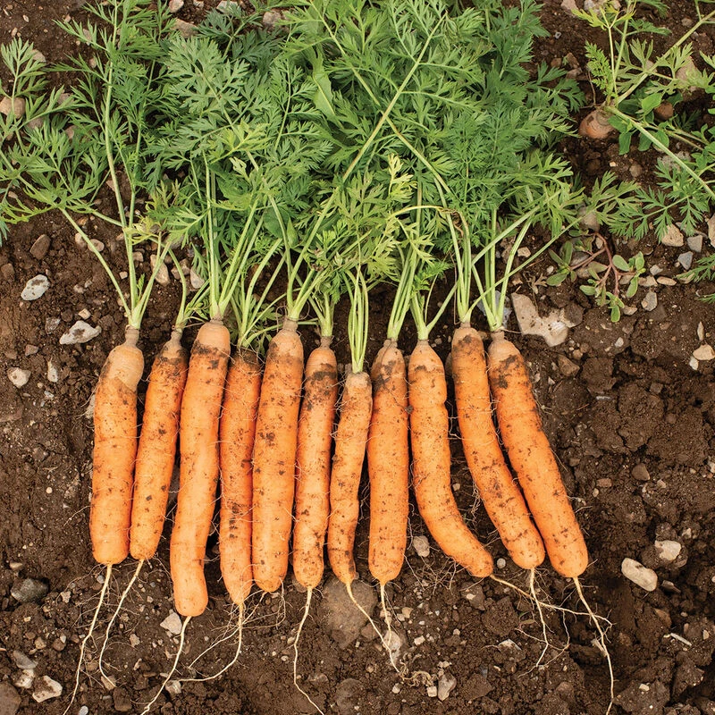 Roots are faster to sweeten, size-up, and blunt than other early carrots, yet they retain a baby-size, 3–4″ length, at full maturity. Short, proportional tops are strong enough for making attractive, compact bunches. Adaptable for higher planting densities, which makes it exceptional for winter tunnels and containers. Amsterdam type. Also available with NOP-compliant pelleting.
