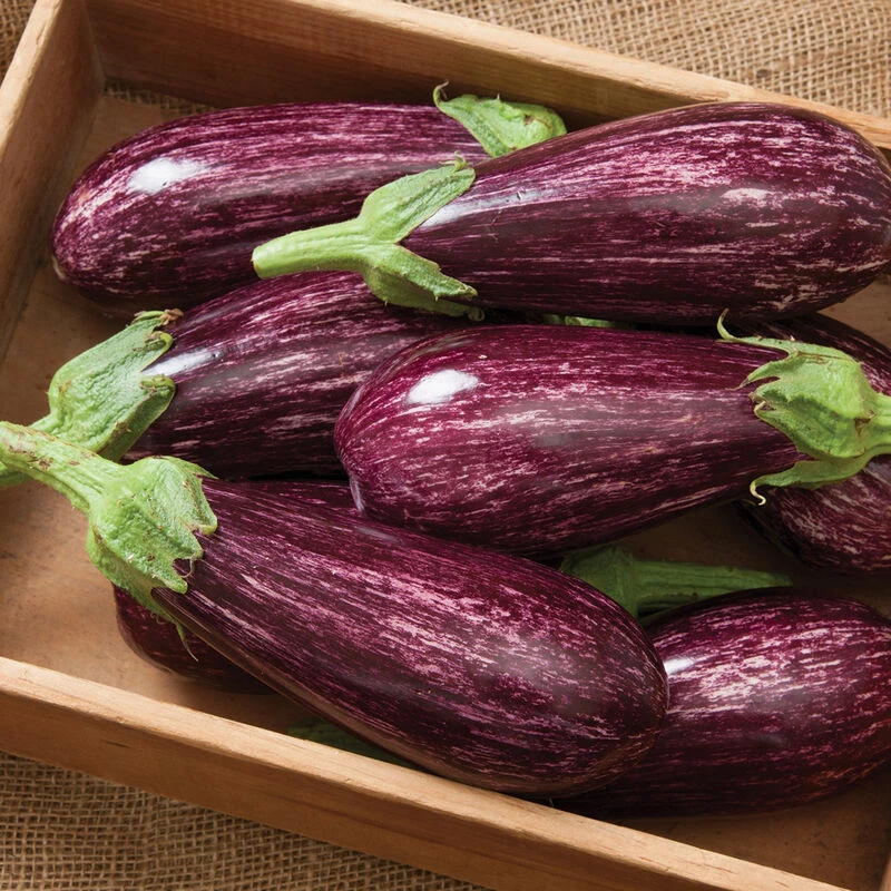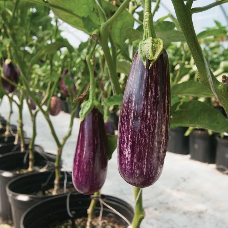 Excellent flavor from visually striking, glossy, dark purple fruits with white striping. Angela has very high yields and a strong plant to make it through the long greenhouse season. Typically picked at half-pound size. Reduced-spine plant with green calyx. Also known as Dominican eggplant.