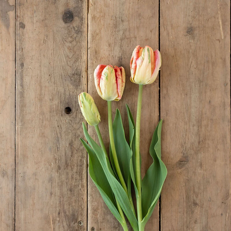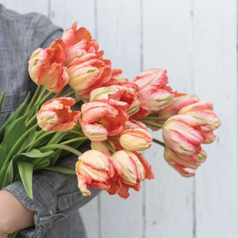 Beautiful peachy-pink tones with green and yellow on the outer petals. Pink tones increasingly develop as the blooms mature. Taller and more uniform than Salmon Parrot, with more deeply scalloped petals. In color, Apricot Parrot is more coral-pink than Salmon Parrot, which is a shade or two closer to orange-salmon. The 2–3″ blooms are very lightly fragrant. NOTE: Bulbs do not come pre-chilled; if growing in hardiness Zones 8–10, see growing information (below) for pre-chilling instructions.