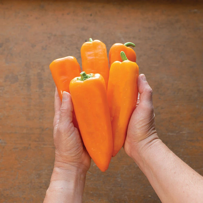 A popular class of peppers, cornitos are 1–1 1/2″ wide at the shoulders and 5″ long. They are exceptionally sweet and attractive smaller versions of Carmen and Escamillo, with similar maturity. Perfect for grilling and roasting. Productive plants. Grow and sell them individually, or as mixed colors, loose or in clamshells. Known as a kapia type in Europe, where it is quite popular. Bred by Janika Eckert and Emily Rose Haga. USDA Certified Organic.