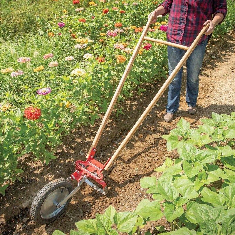 This classic wheel hoe was designed after the original Planet Jr. model and accepts the same attachments. Highly maneuverable and perfect for cultivating garden beds and footpaths much faster than with a hand hoe. Elegant ashwood handles are ergonomic and comfortable to use. Fully adjustable for height, handle angle, and attachment angle. Includes an 8″ wide center-mounted oscillating hoe blade and offset handle brackets for operation from the footpath. 12″ wide model also available. Imported from Switzerland. Ash handles manufactured in the USA.