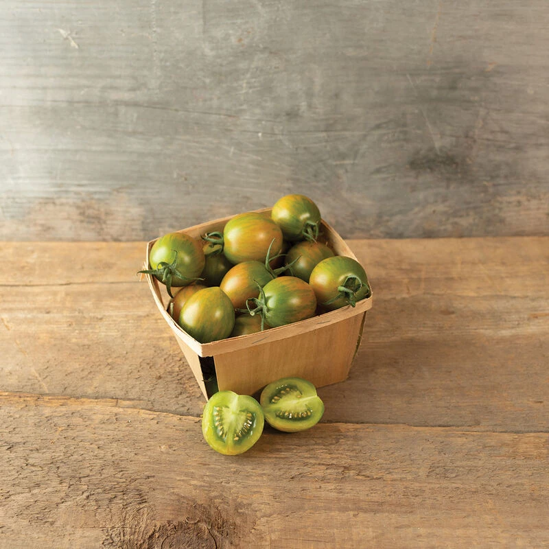A favorite for chefs and growers for its tangy flavor, firm texture, and extraordinary shelf life. A crispy-ripe tomato with tremendous culinary potential, Green Bee has appeared on menus in the San Francisco Bay Area in a variety of dishes. Very firm texture is ideal for grilling and roasting, but Green Bee can also be used for pickling, gazpacho, salsa fresca… you name it! A great choice for eaters who do not typically like fresh tomatoes, as the “tomatoey” flavors are muted in this variety. When left on the vine, it can even develop hints of stone fruit flavor. Fruits avg. 25–30 gm. Best picked when skin develops a clear yellow-orange hue, or later, because fruit can hold for a long time on the vine without cracking or softening. Can be stored for a few weeks at room temperature or 2–3 months at 55°. Bred by Dr. Fred Hempel of Artisan Seeds. Indeterminate.