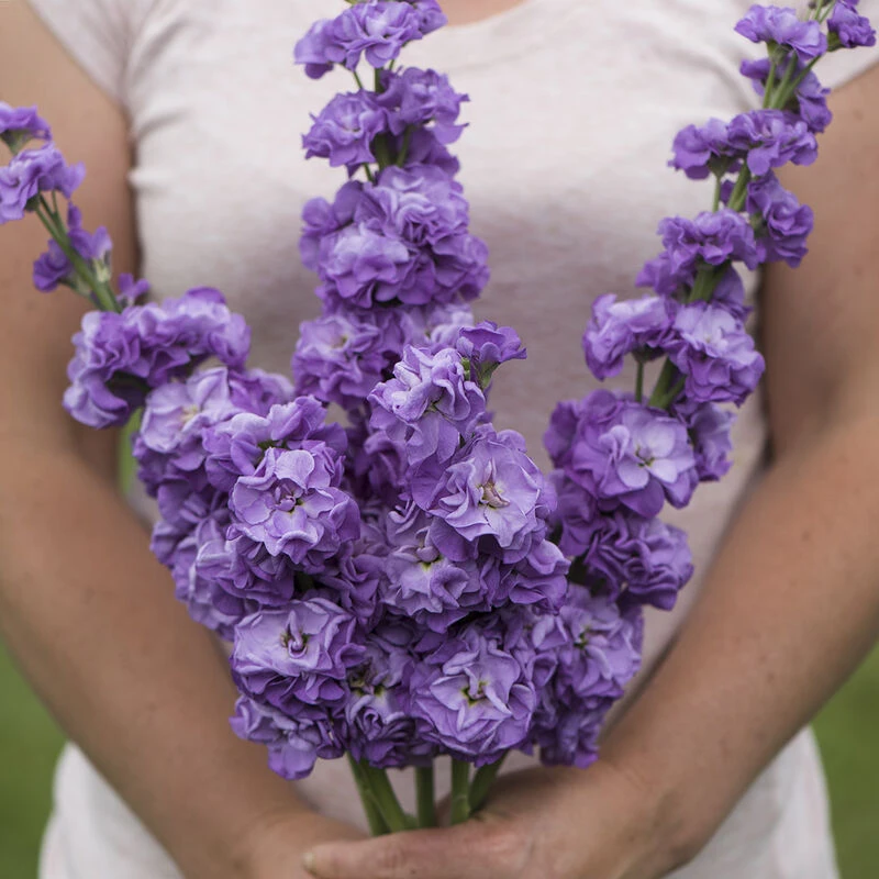 Early single-stem, or column-type stock in a highly uniform series for one-cut harvest. Aptly named for strong, straight, rigid stems. Iron performed well in our spring, early summer, and fall trials. Selectable for doubles and 55% double without selection. Compared to Katz, Iron is slightly later to flower, and has somewhat shorter and thicker stems. Tightly spaced florets on the flower spike make for compact 1 1/2β2″, blue blooms with a full appearance. NOTE: This variety produces one flowering stem per plant. Pinching is not advisable as it will terminate flowering.
