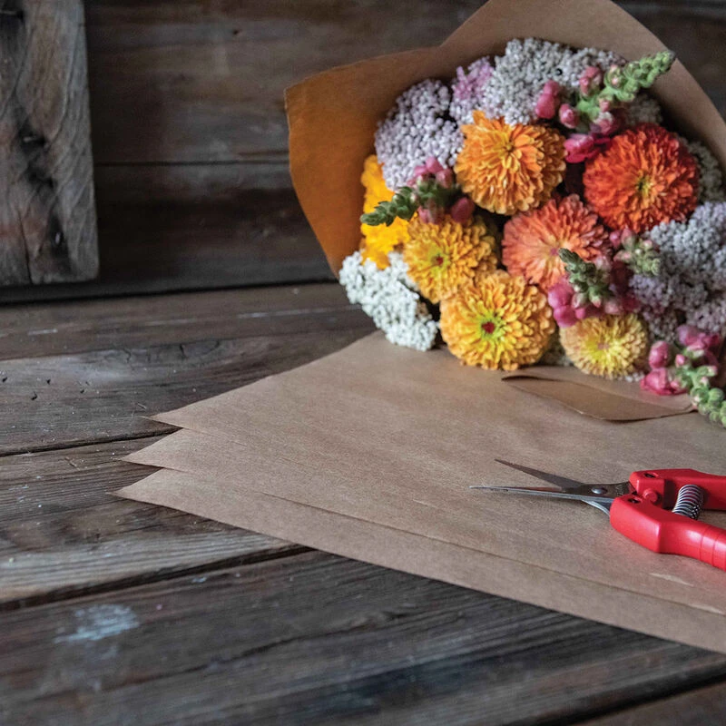 Renewable, sustainable, and increasingly popular among flower farmers, these brown kraft paper sheets allow you to wrap your bouquets tightly and let the blooms speak for themselves. Fasten with a stapler or seal with your own sticker label for a highly professional look that promotes your own brand. 24″ x 24″. 500 count.
