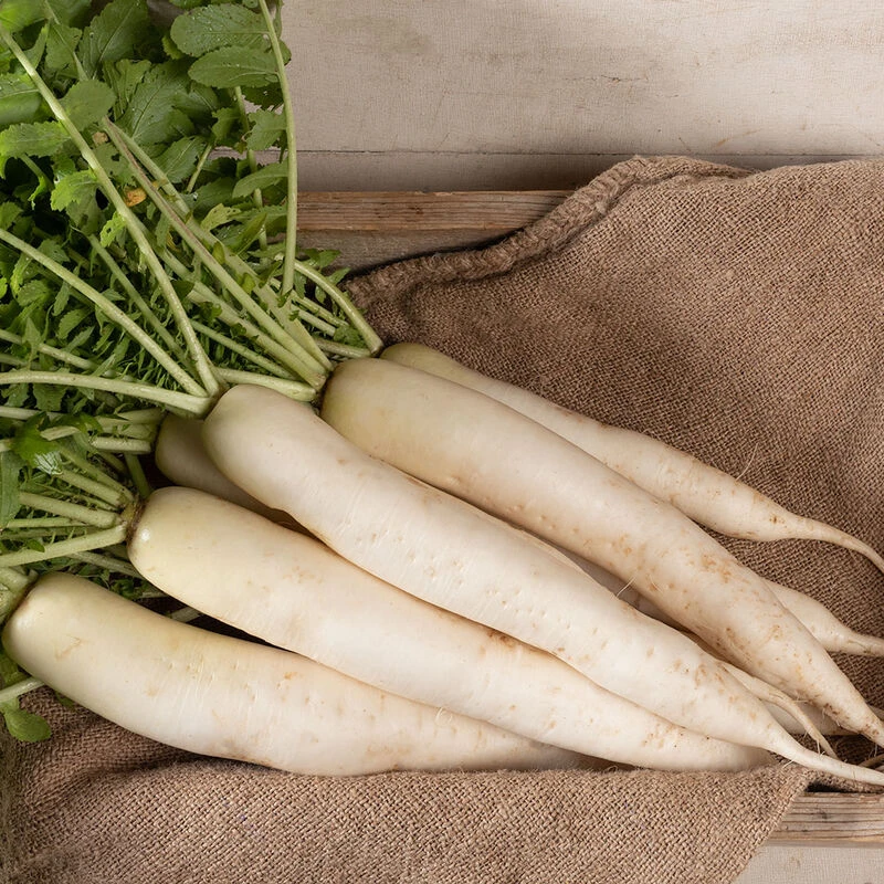 Crisp, Japanese-type fall radish of highest quality. “Stump-rooted” cylindrical white roots are pale green near the crown and avg. 16–18″ long x 2 1/2–3″ wide. A crisp, tender variety for pickling and storage. For July and early August sowing.
