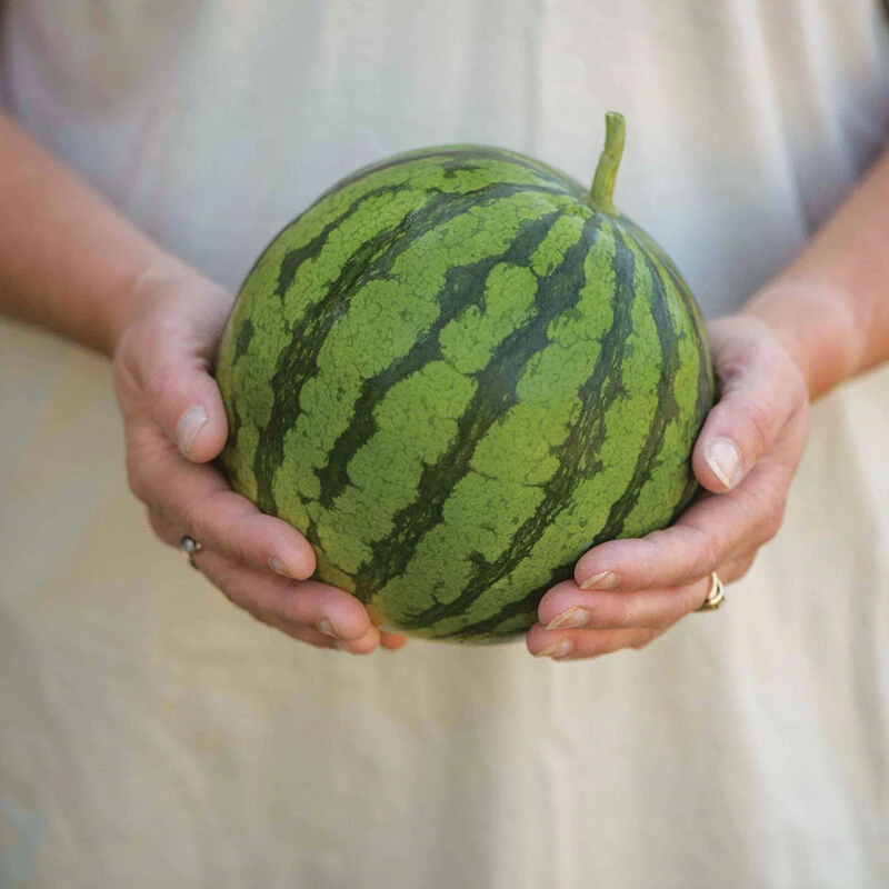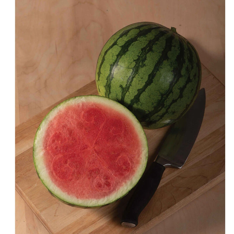 Our smallest seedless watermelon at 3–5 lb., Ocelot has a striking tiger-striped rind. Mouth-watering flesh and firm, dense texture combine for an excellent eating experience—tastes like summer! Holds in the field for an extended harvest window. Flesh is rich red and remarkably sweet. Round/oval shape, avg. 7″. Avg. 2–3 fruits/plant. Seeds of a pollinator and complete growing instructions are included with each order.