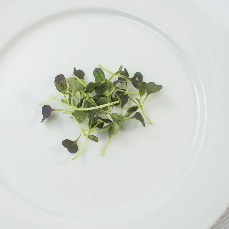 Leaves are mostly red with some green. Mild pac choi flavor. Based on our yield trial, we recommend seeding 10.5 gm per tray at approx. 3 flats per oz. of seed. Avg. days to maturity was 13 days when harvested at the first true leaf (as opposed to cotyledon) stage. USDA Certified Organic.