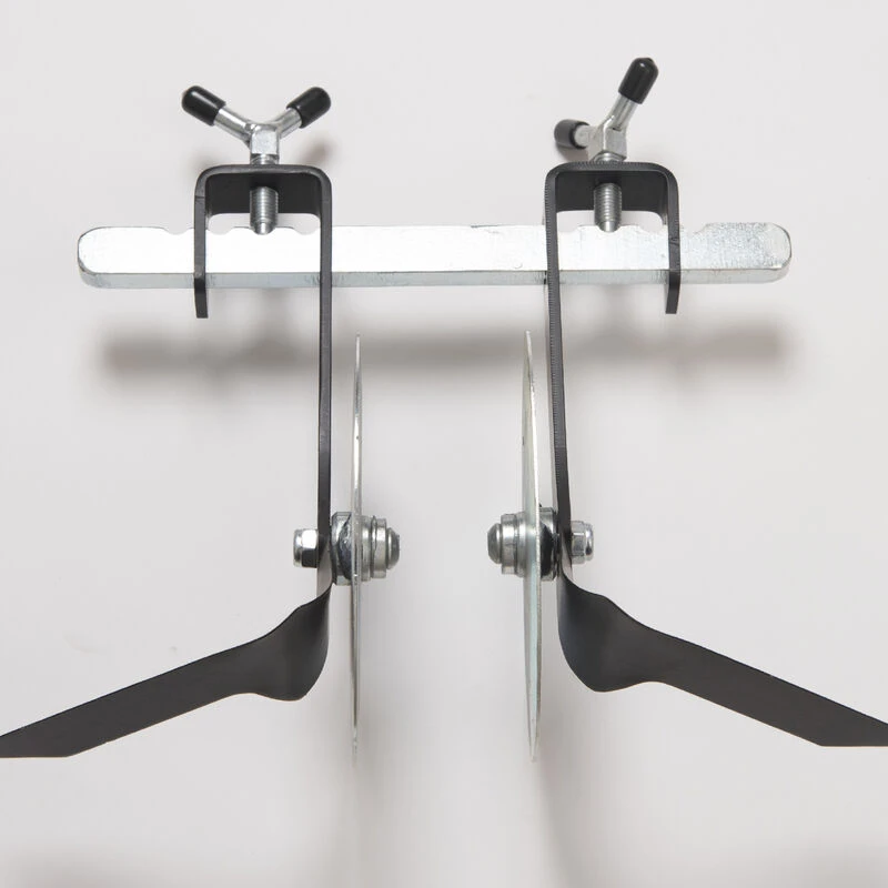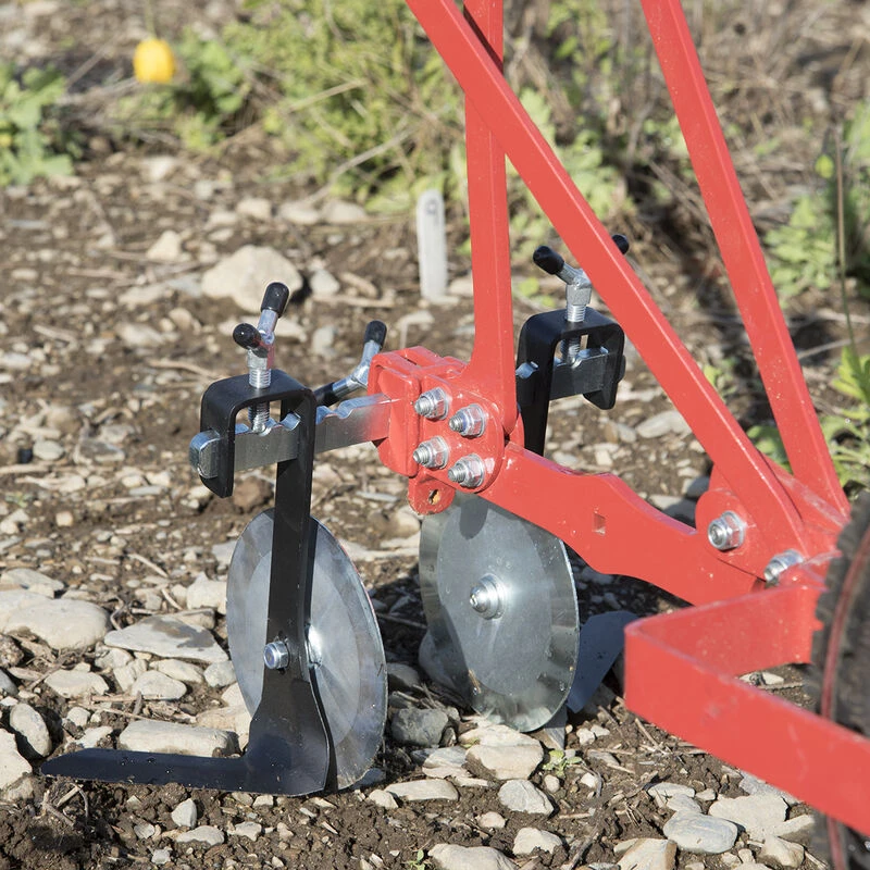For use with Terrateck Wheel Hoes only. Ideal for hoeing young carrot seedlings three weeks after planting. Improves steering. After crop exceeds 2″ wide, discs may damage the crop, at which time the L-Blades are recommended. Includes set of two sweeps (left and right), two 5 1/2″ crop-protecting flat discs, 10″ toolbar, and two Y-bolts. Made in France.