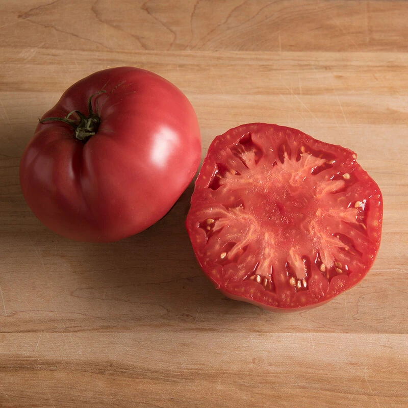 Large to very large (many over 1 lb.) fruits are flattened and smooth (except for shoulder ribbing on some), and resist cracking. Vivid dark-pink skin with crimson flesh. Medium-tall, potato-leaf plants. Indeterminate. USDA Certified Organic.
