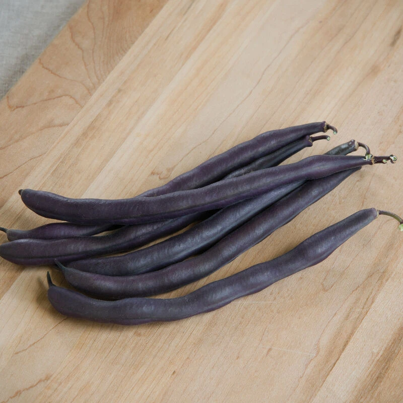 The brilliant purple, 5β5 1/2″ pods are eye-catching at market, easy to spot when harvesting, and add stunning color to salads when used raw. The pods do turn green when cooked. Upright plants are dark green with a purple tinge. Buff-colored seeds. Bush bean. USDA Certified Organic.
