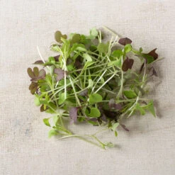 A colorful blend of red and green mustards with various textures. Spicy flavor pairs well with the Mild Micro Mix. Based on our yield trial, we recommend seeding 7.5 gm per tray at approx. 3.5 flats per oz of seed. Avg. days to maturity was 13.5 days when harvested at the first true leaf (as opposed to cotyledon) stage. Varieties are subject to change depending upon availability.