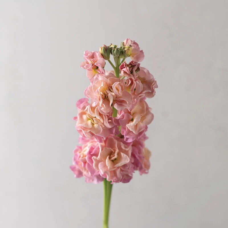 Completely unique, soft peachy-pink color—a standout in our trials. Single-stem or column-type stock for one-cut harvest. Sturdy, upright stems are comparable to the Iron Series. Double-flowering plant selection: Plants are selectable for double-flowering blooms. Without selection your plants will produce approximately 55% double-flowering plants and 45% single-flowering plants. Double-flowering plants will display a lighter leaf color at the seedling stage after a cold treatment. You might notice that some seedlings will present the lighter color leaves, even without a prescribed cold treatment. NOTE: This variety produces one flowering stem per plant. Pinching is not advisable as it will terminate flowering.