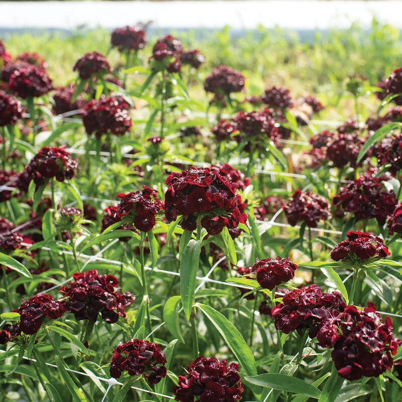 2–5″ rounded clusters of single-petaled, deep red velvet (almost black) blooms on long, strong stems. Bred for greenhouse and high-tunnel production but also suitable for open field. Demonstrated excellent performance overall in our fall-planted, overwintered and unheated tunnel trial; it bloomed about 4 weeks earlier than Amazon. Plant vernalization is not required to initiate flowering. Fragrant blooms. Plants are high yielding, producing long-lasting blooms, up to 14 days. Tender perennial in Zones 6–8. Pelleted seeds.
