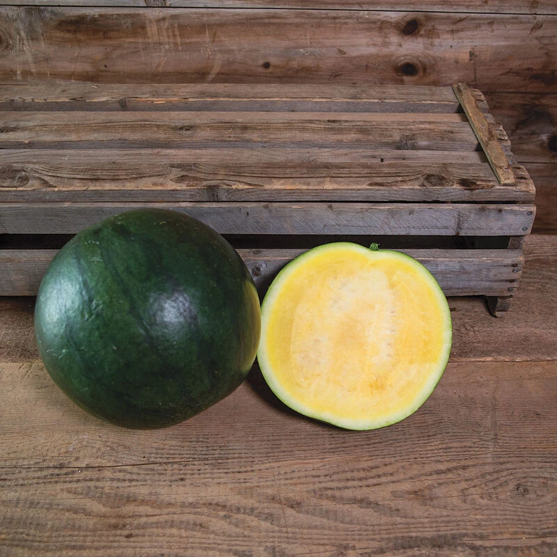 Bright flesh with crisp, melt-in-your-mouth texture. Dark tiger-striped rind—almost Sugar Baby type. Icebox-sized fruits avg. 11–13 lb. Improved flavor and sweetness over Amarillo, which it replaced.