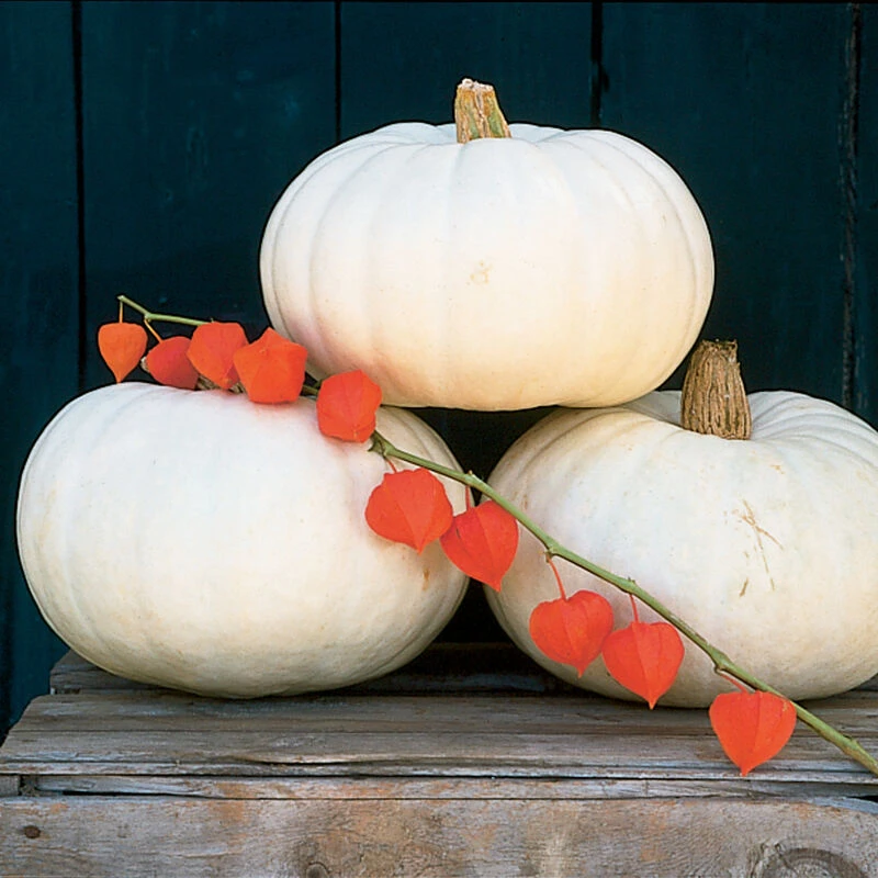 Unique white pumpkin for doorstep decorations and painting. Medium-size, flattened shape with slightly ribbed skin. Thick orange flesh suitable for pies. Avg. 10–15 lb.